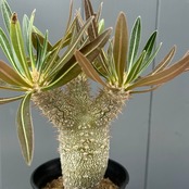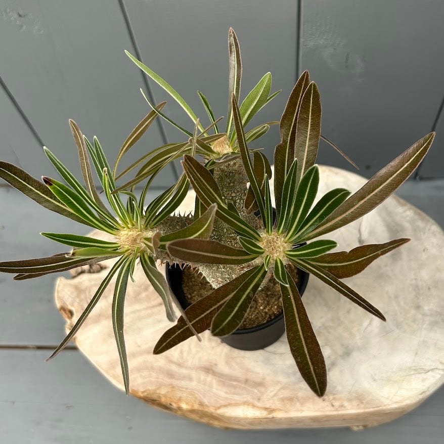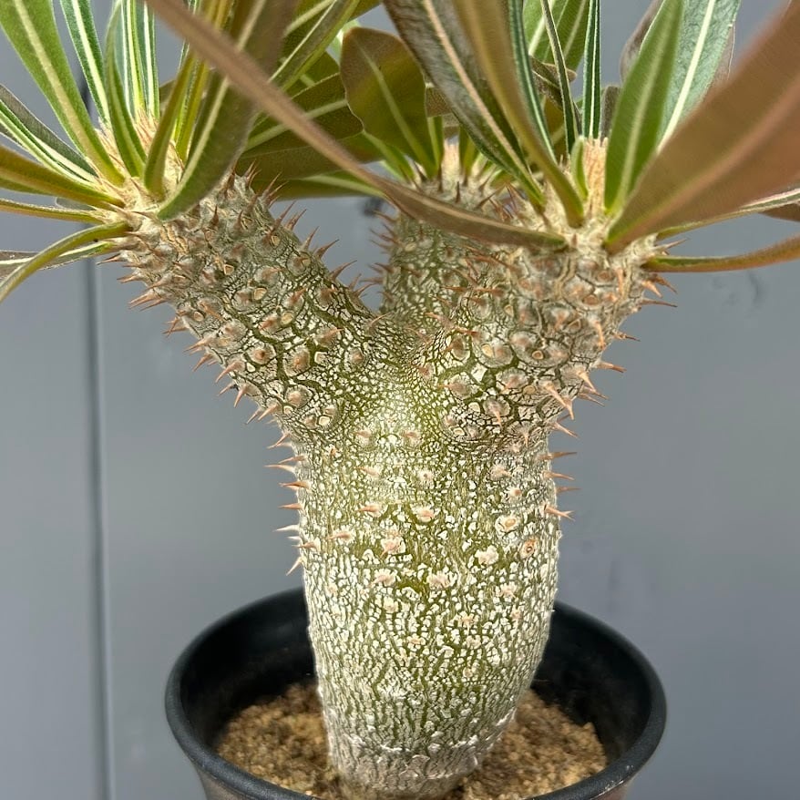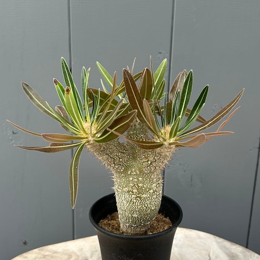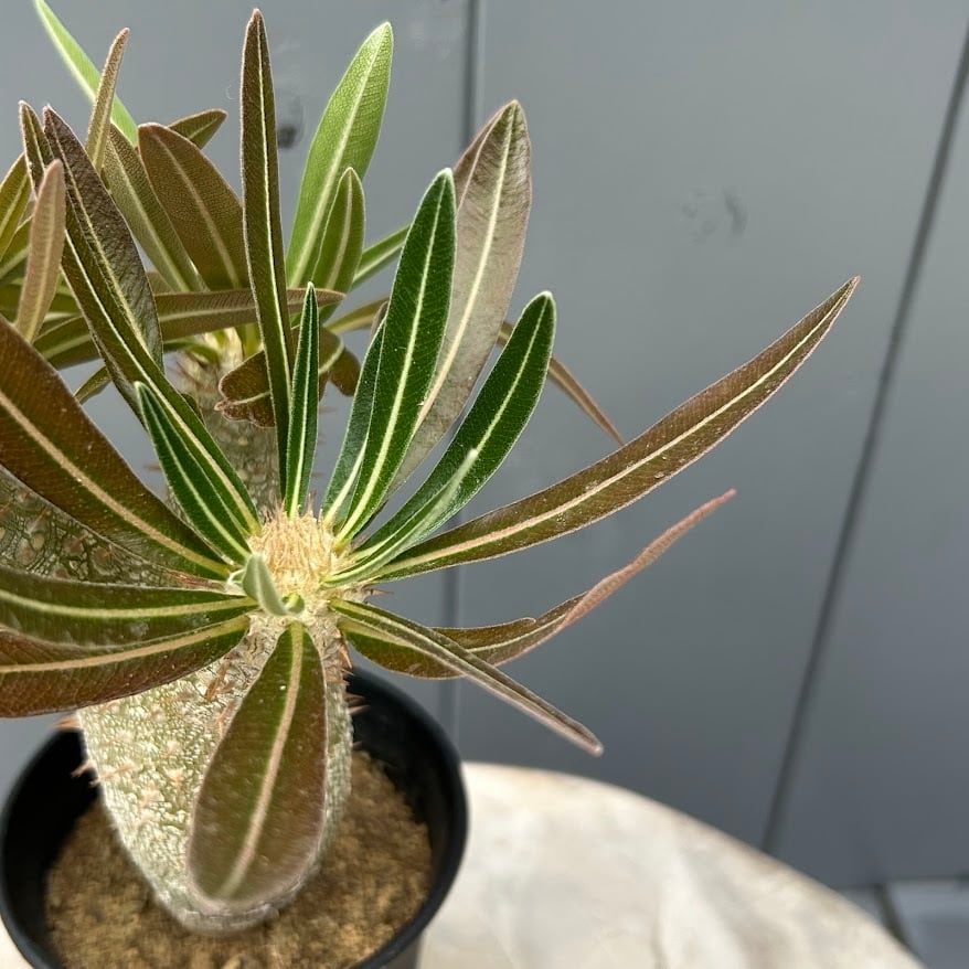 細長い葉とパキポディウムのなかでは比較的白肌の塊根部が特徴です。